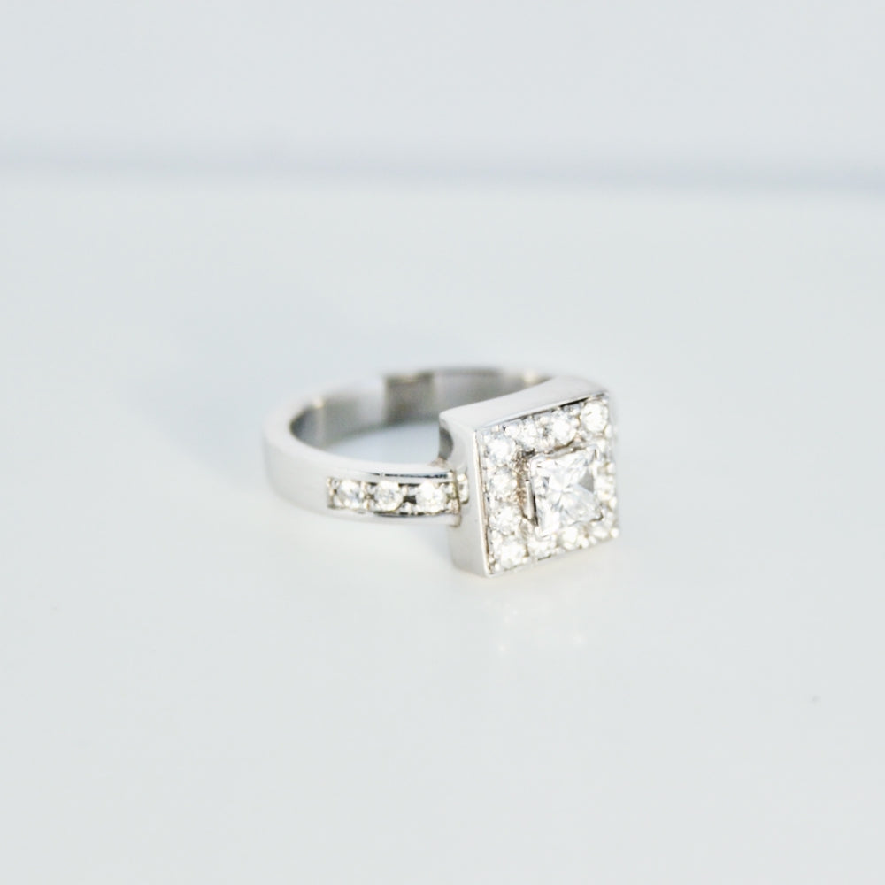 Anillo Oro blanco cuadrado brillante central princess cut 0,48 ct color F pureza VVS2, 6 brillantes en el cuerpo 0,12ct color F pureza VS y al rededor 12 brillantes de 0,36 ct color F pureza VS