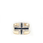Este anillo Bi-Color es la culminación de la elegancia y sofisticación. El oro de 18 kt se impone con una línea en cruz como realce, adornada con preciosos zafiros azules carré y rodeada por 27 brillantes. La joya perfecta para expresar tu estilo refinado. Una joya grandiosa para completar tu look.