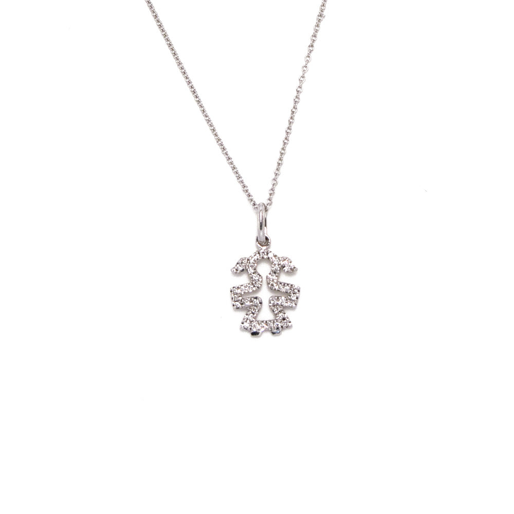 El Colgante Oro Blanco de 18 quilates con forma de Niña posee brillantes de 0.08 quilates color FG y pureza VS, ofreciendo una magnífica combinación de elegancia y resistencia. Los brillantes están sujetos seguros para su durabilidad y lujo.