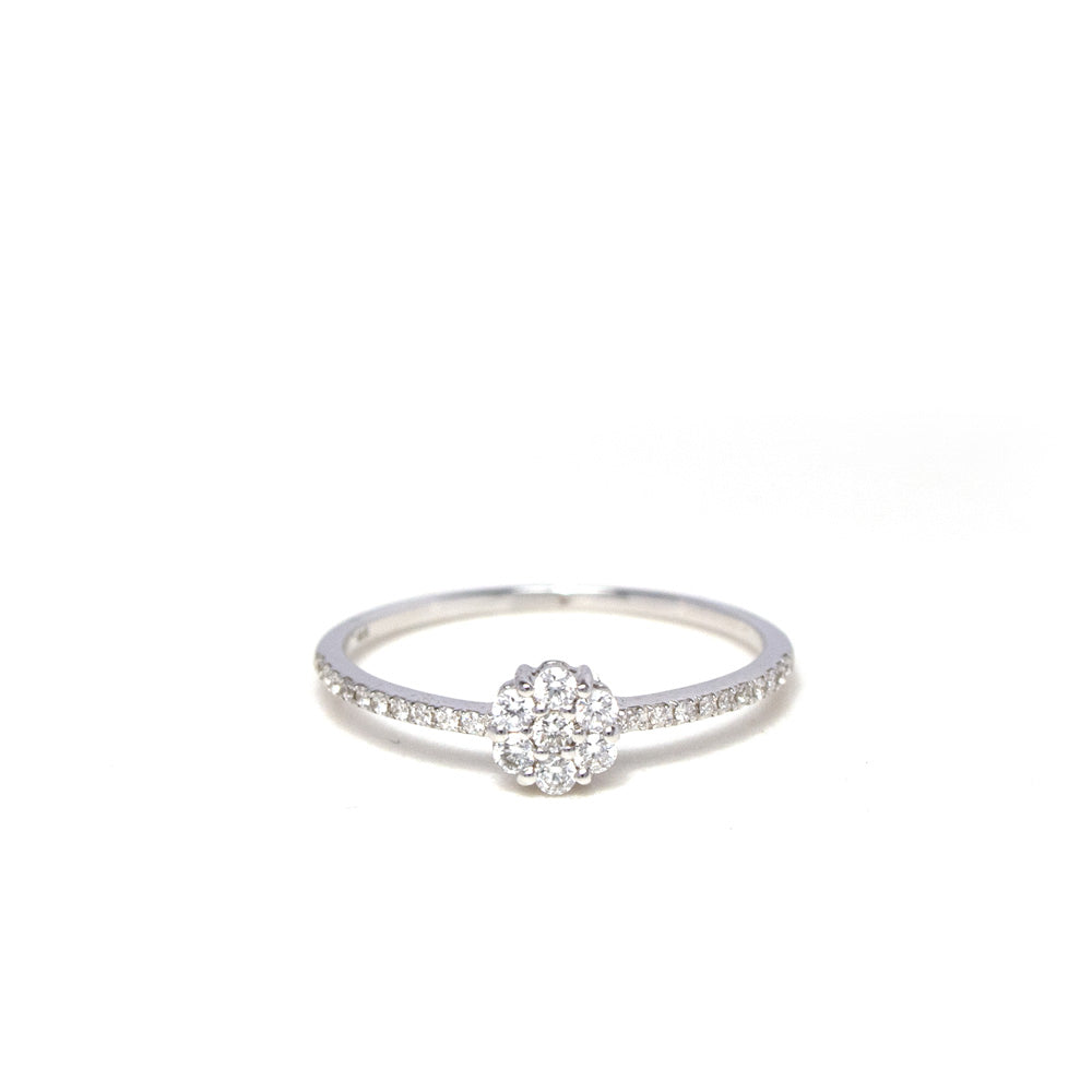 Un anillo de oro blanco diseñado con elegancia y clase. Este solitario ofrece un cuerpo lleno de brillantes que regalan luz, mientras un cabeza con 7 brillantes garantiza la elegancia. brillantes 0.18 ct FG VS SI en Cuerpo. ¡Déjate cautivar con una joya perfecta!