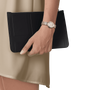 No hay diseño más clásicos que el Bellissima Small Lady. La caja redonda y el brazalete de cinco eslabones son de acero, con reflejos en cálido PVD de oro rosa que dan al reloj su sensación de lujo y su versatilidad para el día y la noche. El reloj tiene una esfera plateada con números romanos y un bello diseño guilloché en forma de rosa, mientras que el último detalle es el deslumbrante cabujón de cerámica blanca engastado en la corona. Con estos elegantes detalles, el Bellissima Small Lady le recordará que la quiere cada día.
