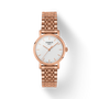 Este modelo en concreto cuenta con un movimiento de cuarzo y una caja en oro rosa de 30mm con una esfera blanca y limpia. Se presenta con un brazalete de acero inoxidable en oro rosa que cuenta con la posibilidad de ajustarse a la muñeca.